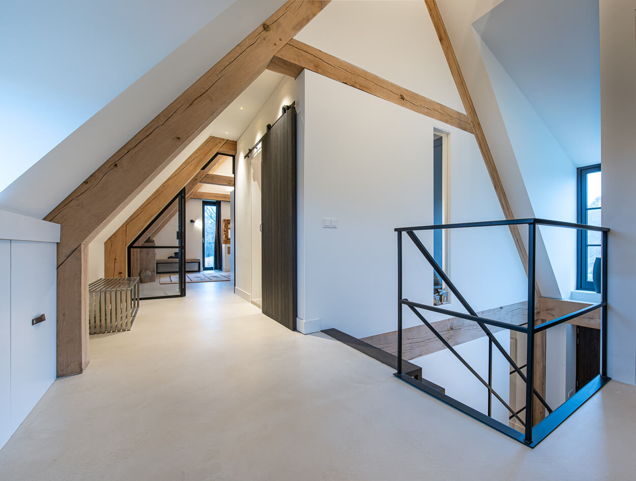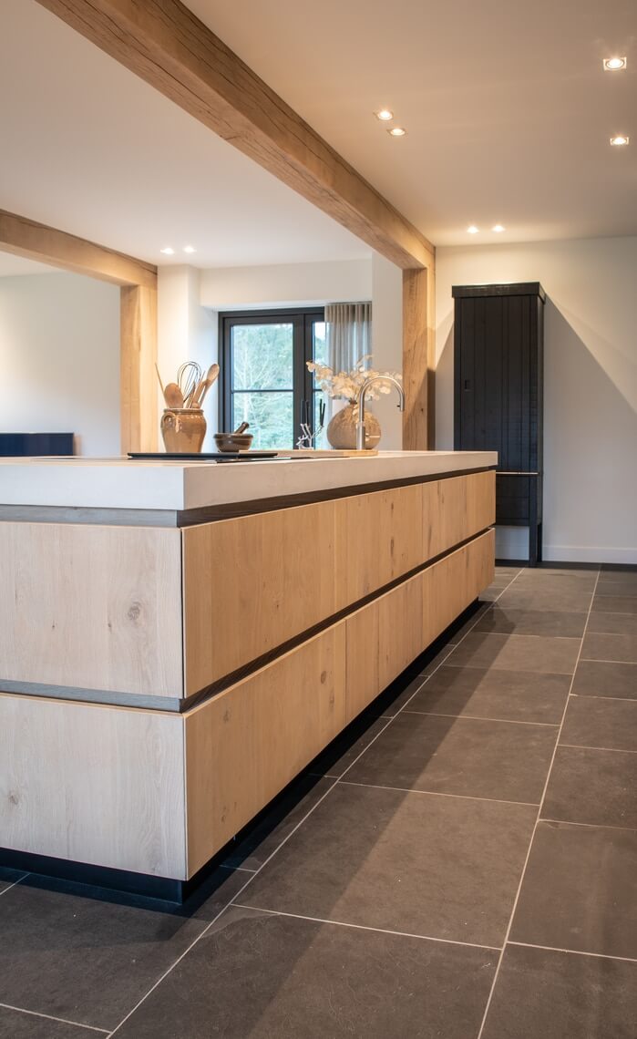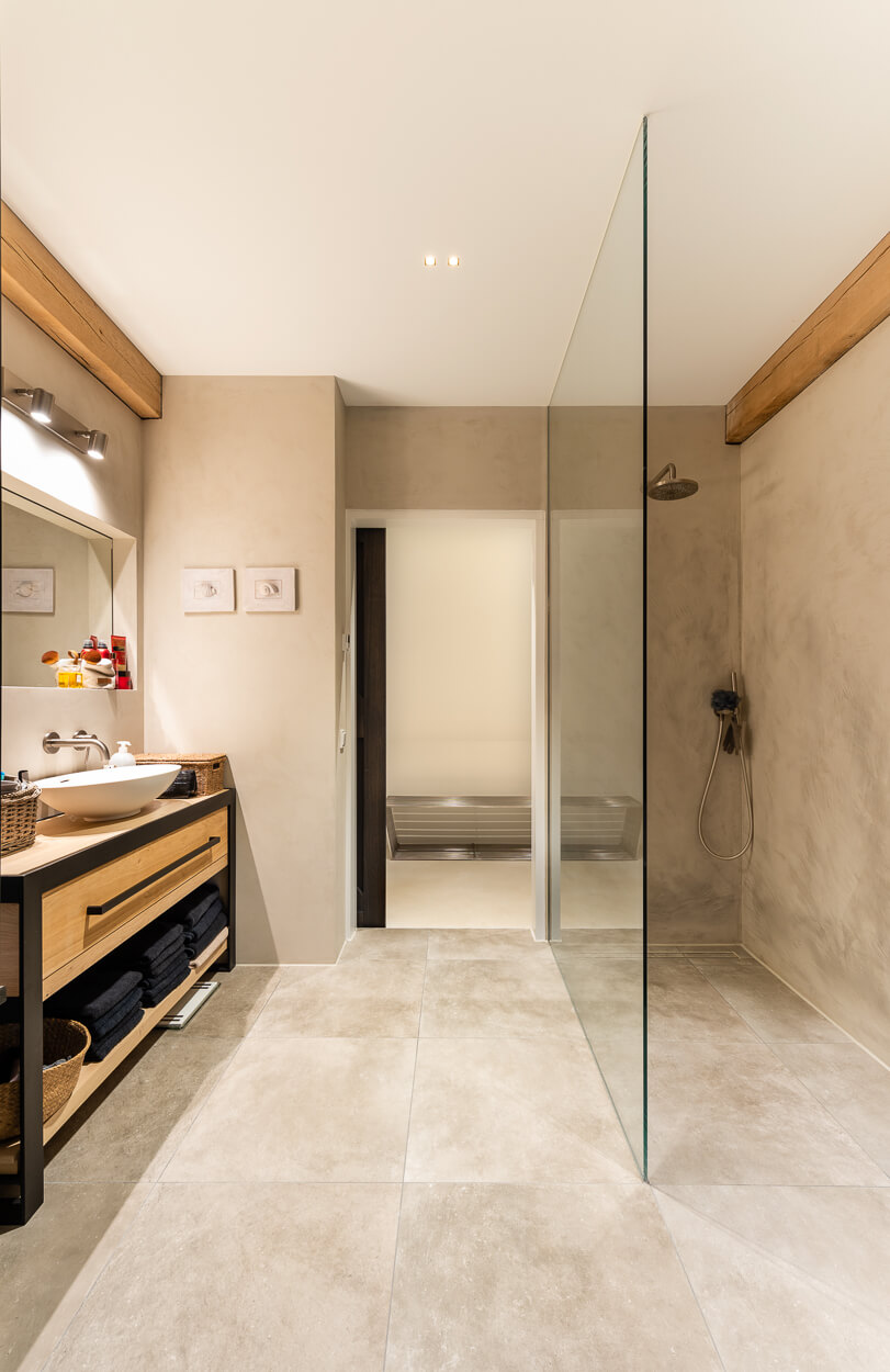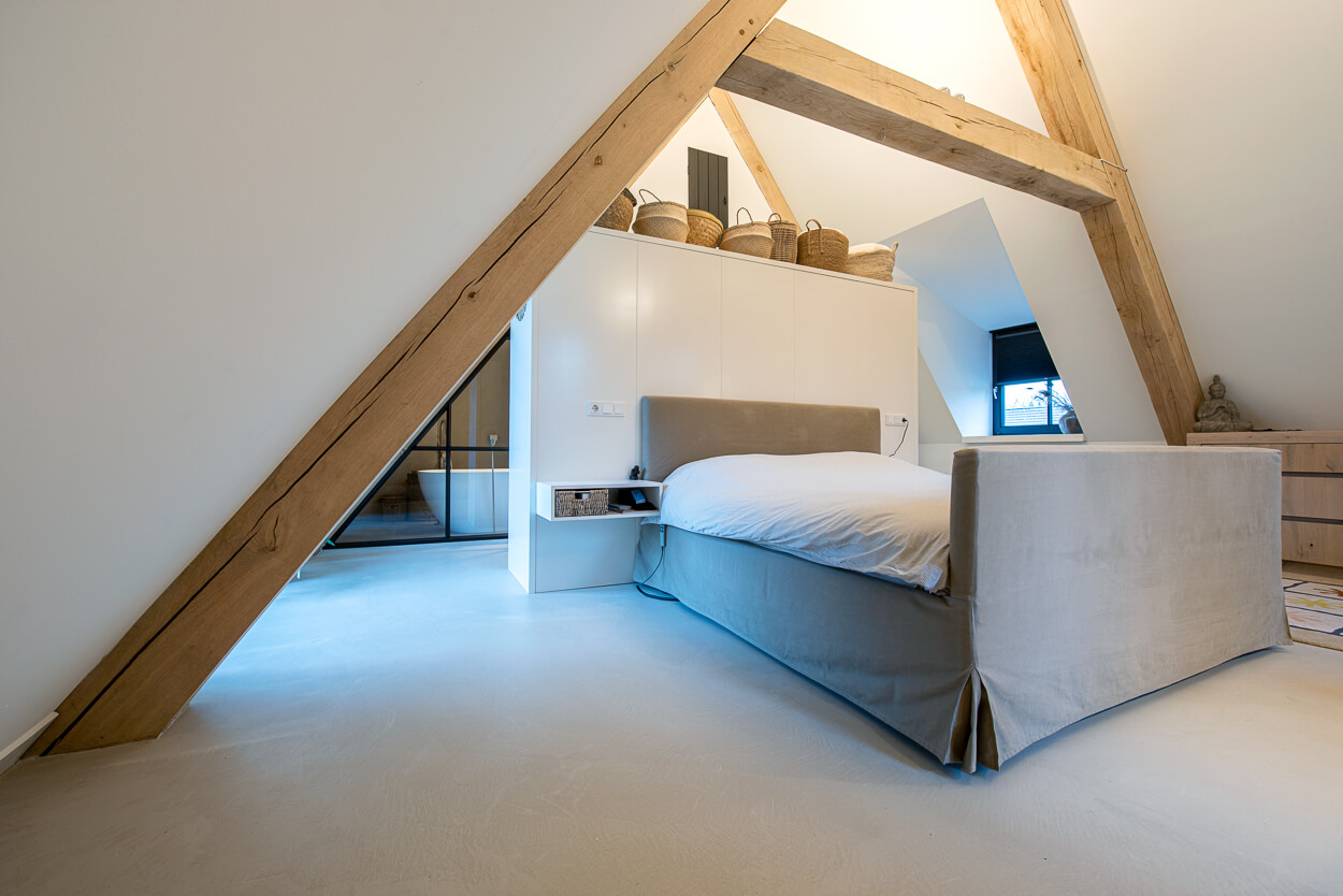 Zowel de wanden in de badkamer en het toilet zijn bepleisterd met microcement. Ook het aanrechtblad en de vloer op de eerste verdieping is bekleed met microcement waardoor alles naadloos aansluit door de gehele woning. Op deze manier hebben wij voor eenvoud en rust gezorgd in het interieur, maar ontstaat er ook een unieke eenheid door de verschillende texturen. Alles klopt van A tot Z.