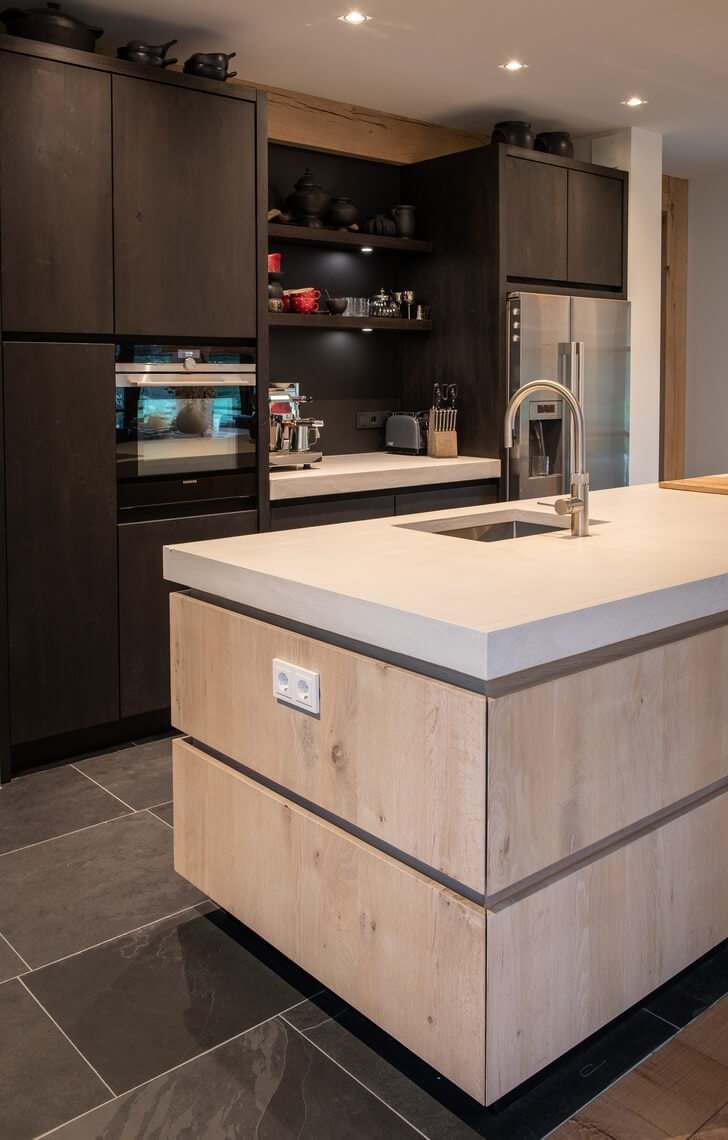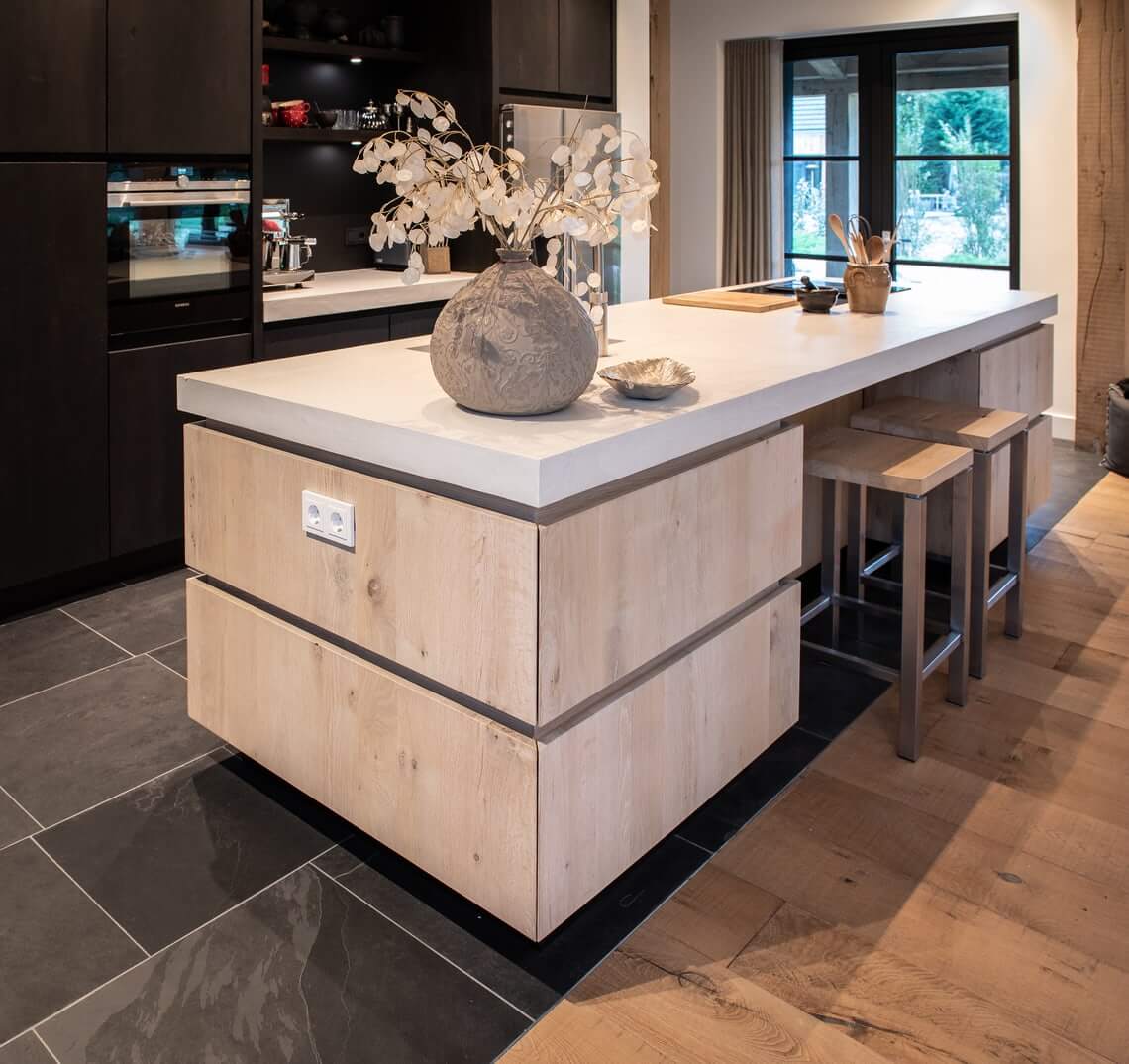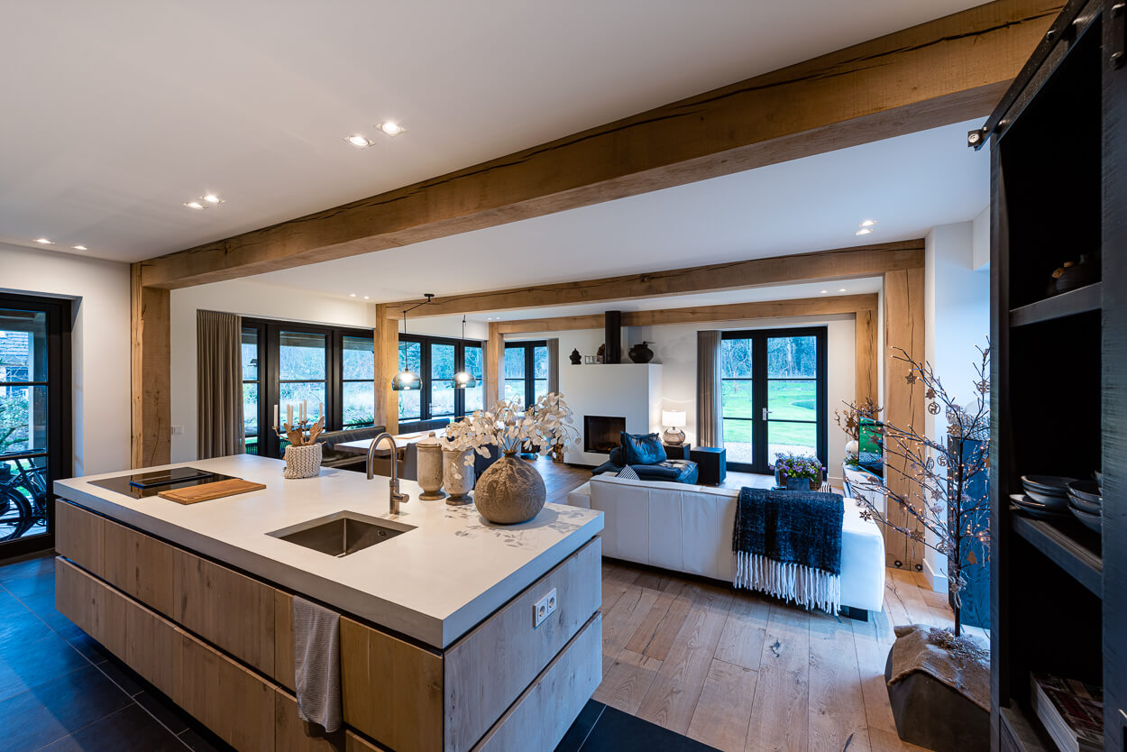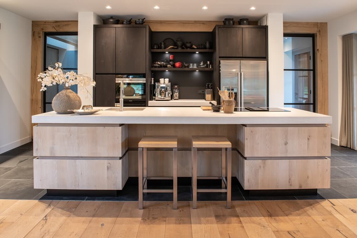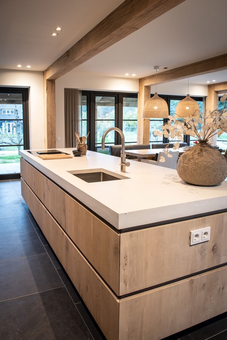 Zowel de wanden in de badkamer en het toilet zijn bepleisterd met microcement. Ook het aanrechtblad en de vloer op de eerste verdieping is bekleed met microcement waardoor alles naadloos aansluit door de gehele woning. Op deze manier hebben wij voor eenvoud en rust gezorgd in het interieur, maar ontstaat er ook een unieke eenheid door de verschillende texturen. Alles klopt van A tot Z.